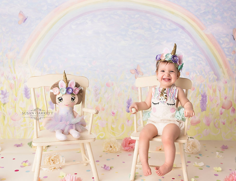 This year (2017) I decided that it was time to incorporate my love for art more into my photography style. I decided to paint a large 9 foot by 4.5 foot canvas drop to use as the backdrop of my daughter’s session. I couldn't find a backdrop that had everything I wanted because, granted, I may have just bought one if I had. This painting took me 10 hours to complete. I wanted something magical, something that when you saw it you felt like you were invited to be there. I envisioned something beautiful, colorful (but pastel), a rainbow but not a cheesy one. I wanted to incorporate a field, tall grass, butterflies, and I even thought about painting a unicorn, but I decided to let Selah be the unicorn instead:-)
